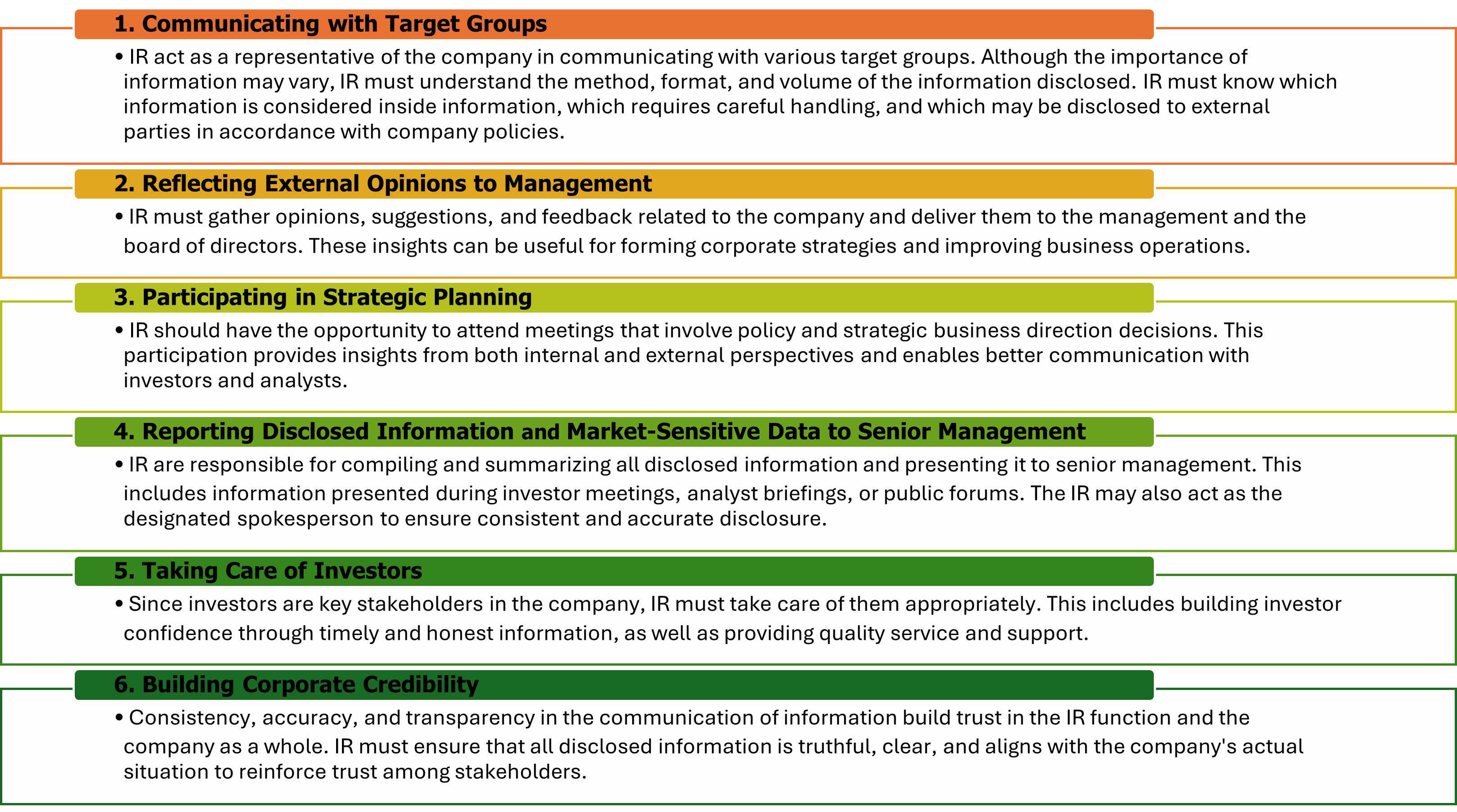 Investor relations must ensure equal and fair disclosure of information, providing all relevant parties with access and the opportunity to inquire about such information.