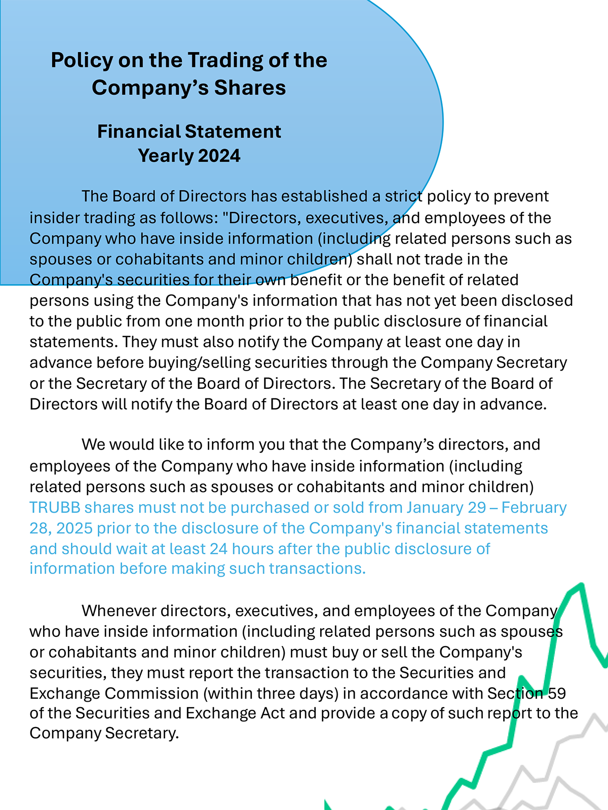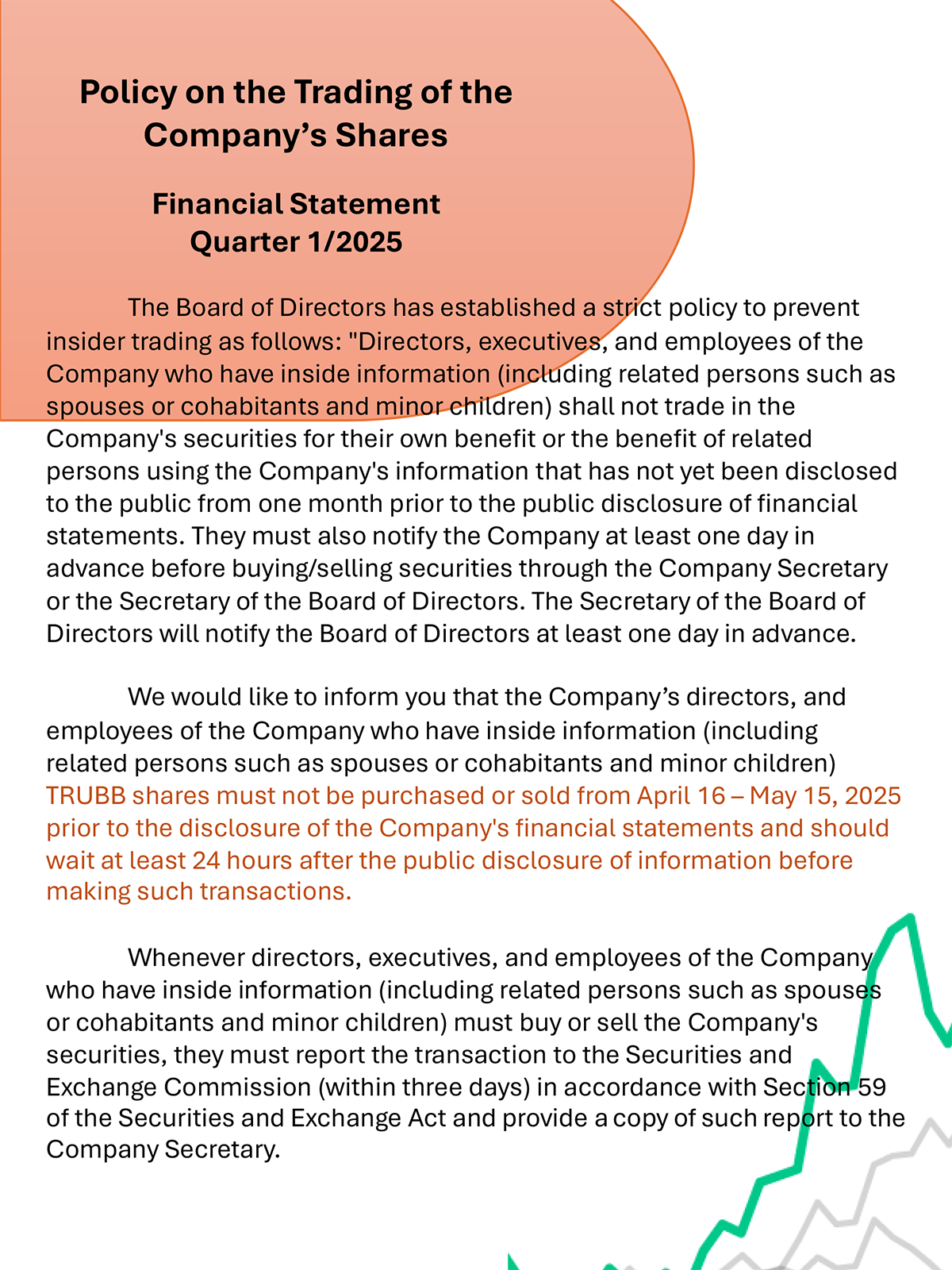 To ensure that the performance of investor relations duties is fair and non-discriminatory, Thai Rubber Latex Group Public Company Limited has established a Code of Conduct for Investor Relations (not as a company regulation or directive), to serve as a guideline for the professional conduct of investor relations. The fundamental principles of this Code of Conduct are as follows: